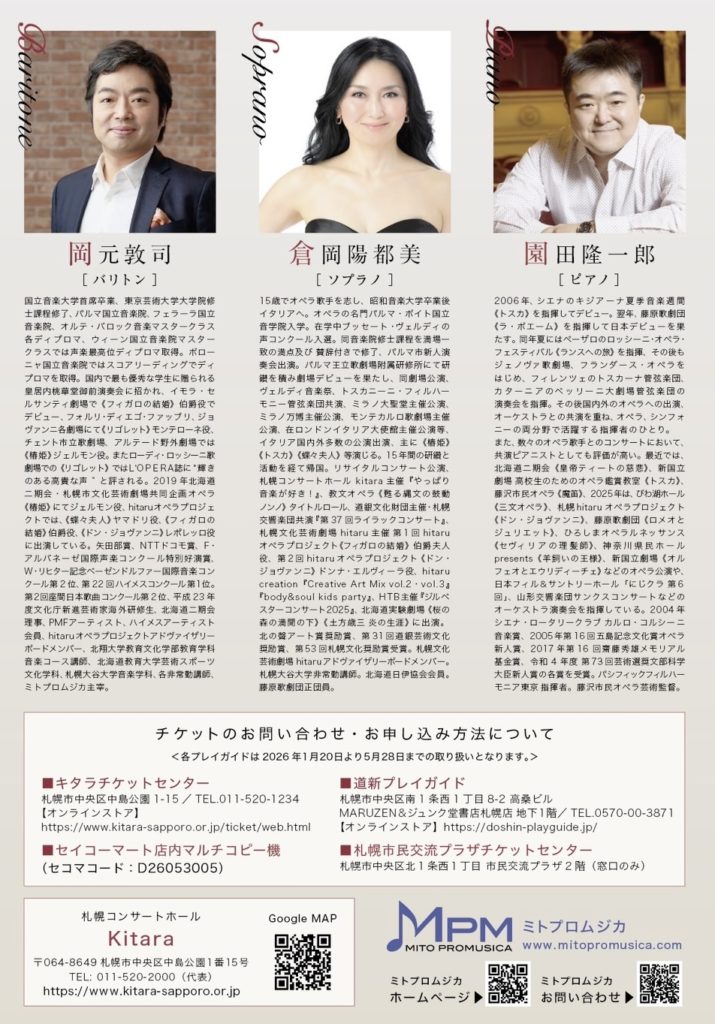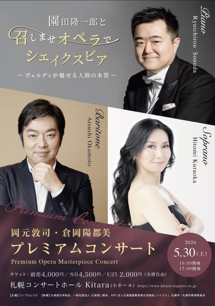 この度 5 月 30 日(土)札幌コンサートホール・キタラ小ホールにて、オペラ指揮者として日本全国で活躍する園田隆一郎氏と共に、道内のオペラ芸術を微力ながら支えたいと願う私たち、倉岡陽都美、岡元敦司によって『園田隆一郎と召しませオペラでシェイクスピア〜ヴェルディが見せる人間の本質〜岡元敦司・倉岡陽都美プレミアムコンサート』を実施させていただく運びとなりました。